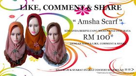 BTW, senang cerita, lawat page AmSha Scarf,... Jangan lawat aje....Like ler sekali... Kemudian Share kat Fesbuk anda gambar tersebut , dan komen... Simple bukan.... Then korang akan berpeluang menang RM 100.. ^^